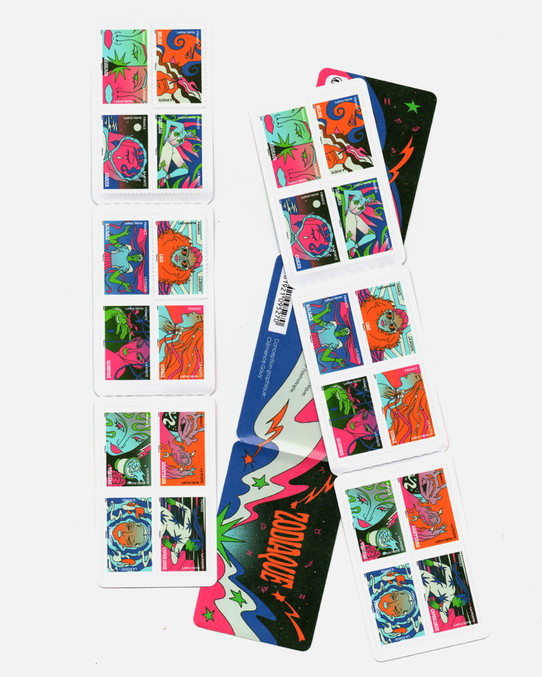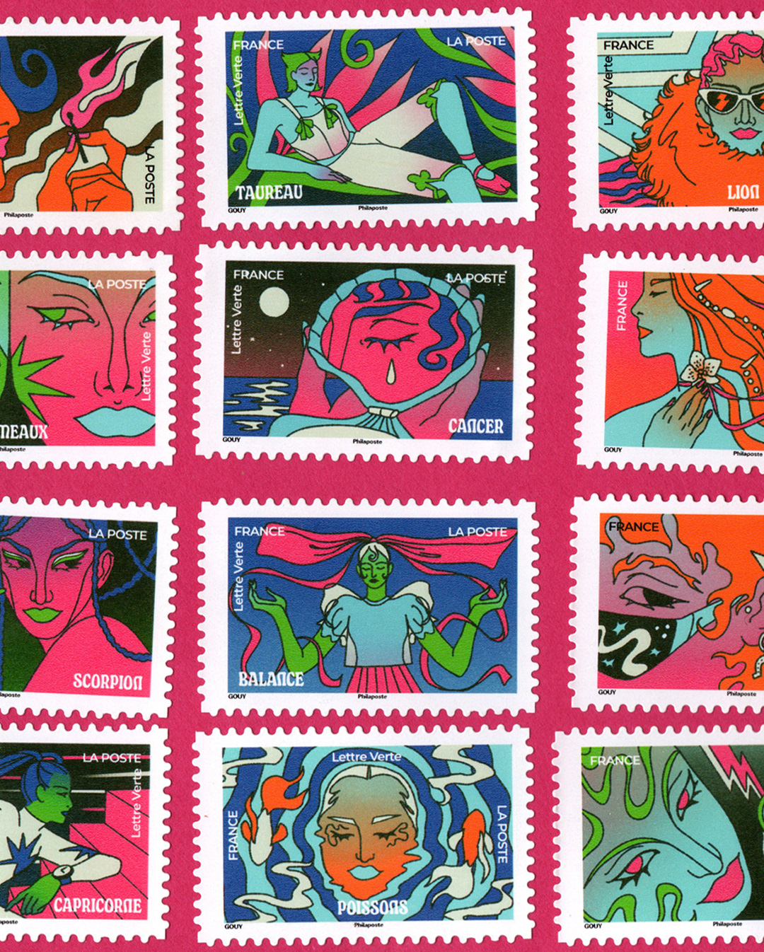 12 Astrology-themed illustrations for a limited edition stamp book available across all France's post offices, inspired by Fashion and retro horoscope cards.